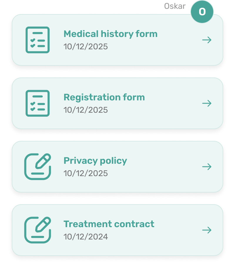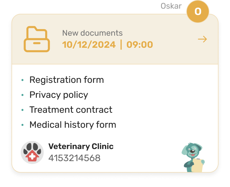 Sit. Stay. Sorted. No paperwork at the clinic: fill in your info, sign, send — done. All digital, before your appointment even begins.